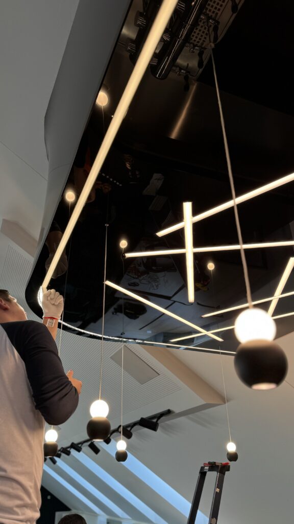 Tato realizace stojí na přesnosti. Atypické zahnutí do rádiusu není jen designový efekt, ale hlavně technická disciplína, kde musí sedět konstrukce, profily i finální napnutí na milimetr. Cílem bylo vytvořit čisté světelné linie, které budou vypadat dobře i ve chvíli, kdy je osvětlení vypnuté. Proto jsme zvolili LED pásky s černými difuzory a řešení, které udrží celý podhled vizuálně jednotný, bez rušivých přechodů.